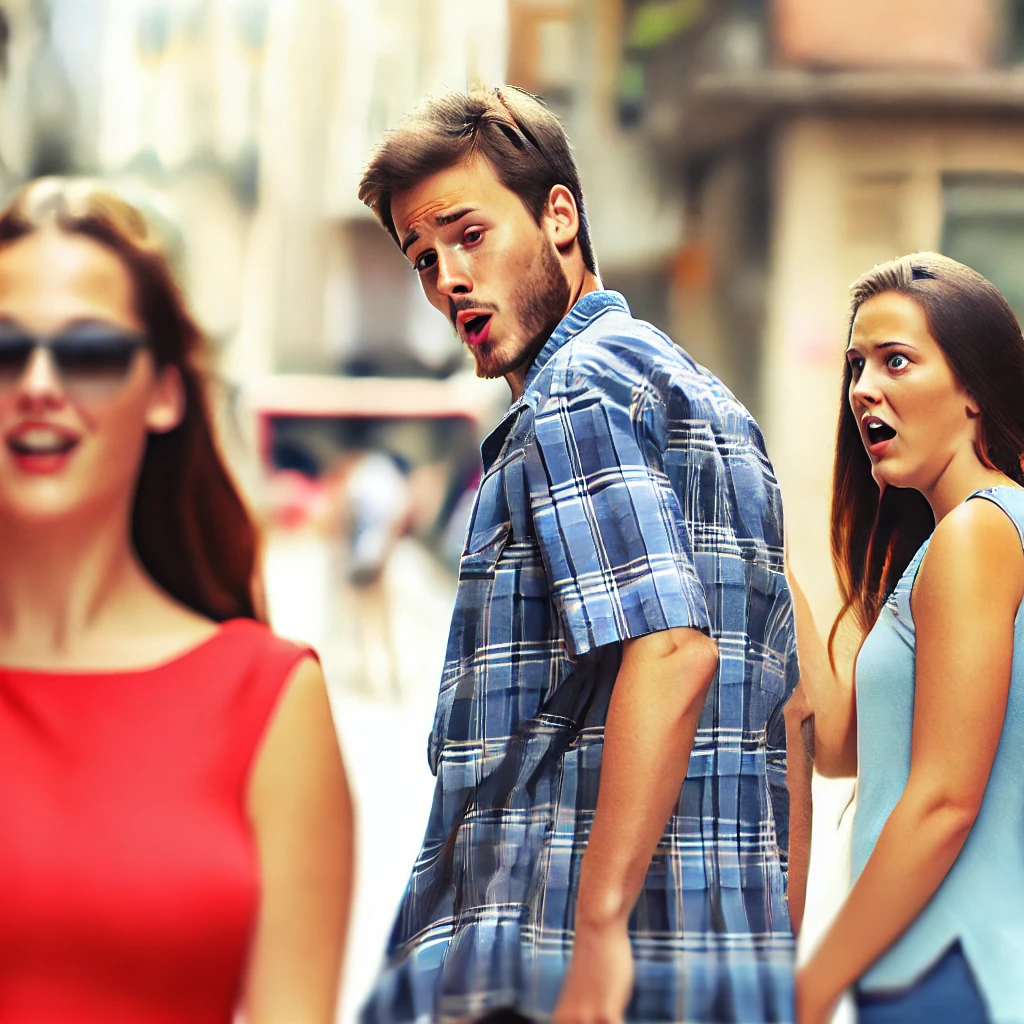 예: Distracted Boyfriend (딴 곳을 바라보는 남자 친구 이미지)
